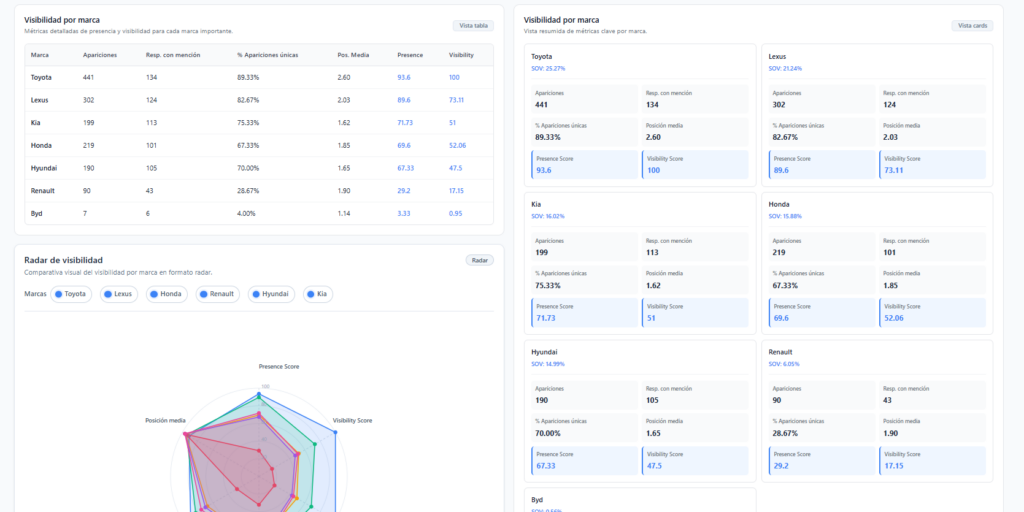 Esta metodología se aplica a través de una plataforma de análisis que permite monitorizar la evolución de la presencia y percepción de una marca en los entornos de inteligencia artificial.